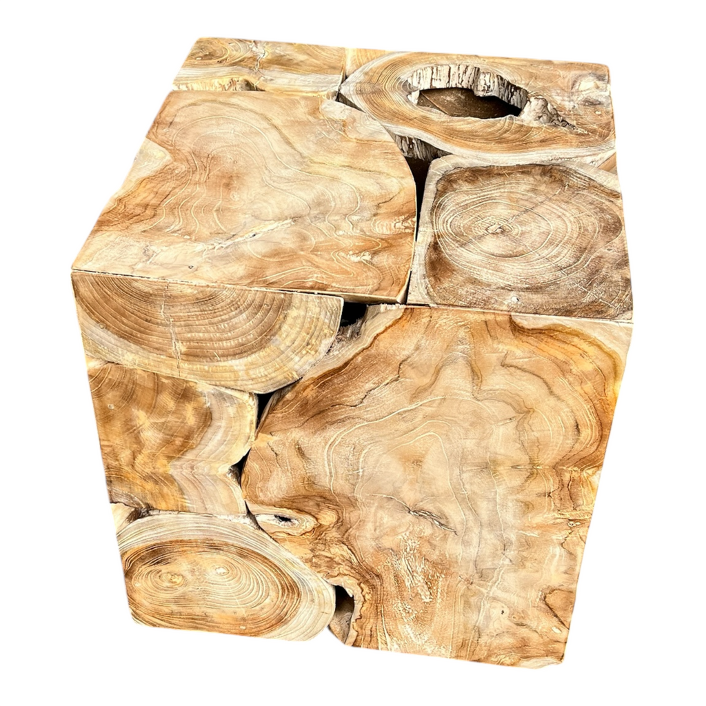 Each piece features distinct color variations and textures that highlight the character and authenticity of the teak. Designed for durability and timeless appeal, these tables bring a sophisticated yet earthy element to any living space, combining expert craftsmanship with natural materials for a functional and elegant accent.