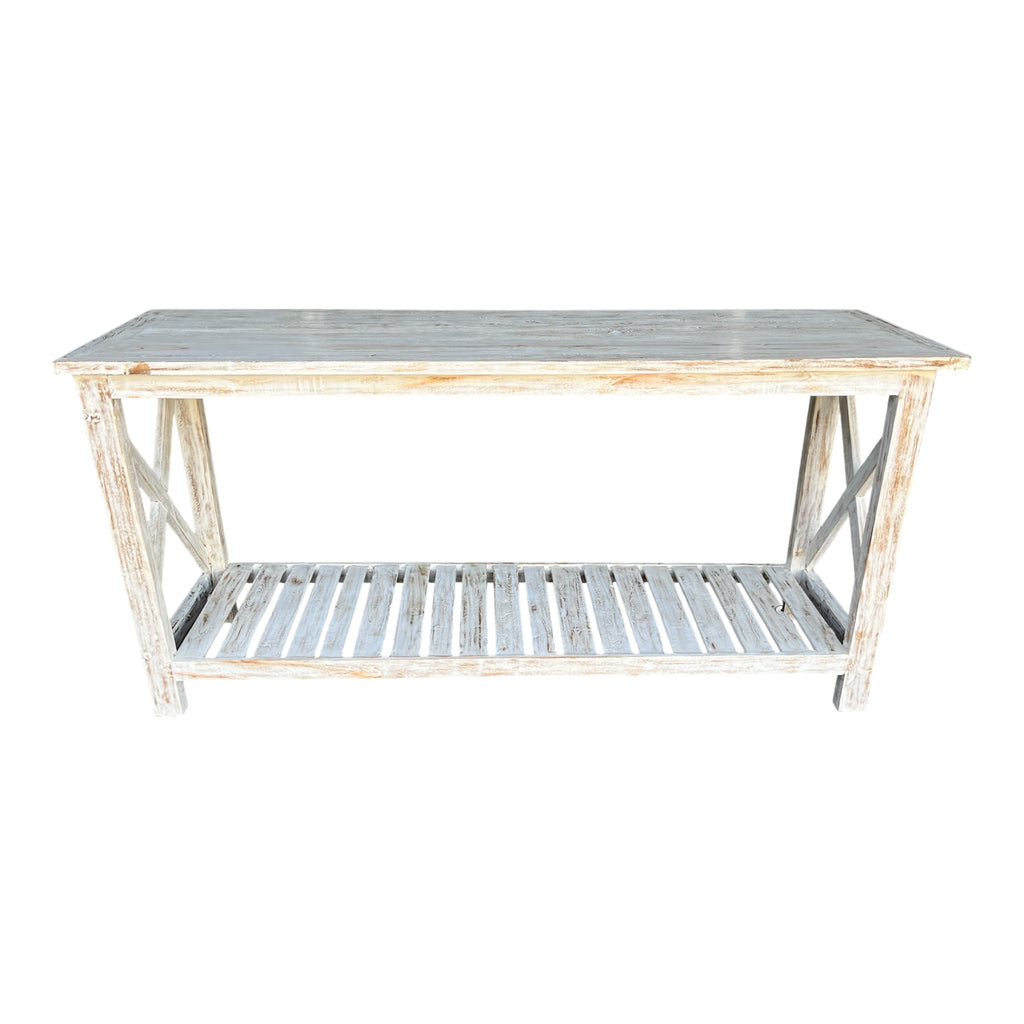 Finished with a whitewash that accentuates the natural grain and color variations of the wood, it includes a practical bottom shelf for additional storage or display. The unique "X" side structure adds both visual interest and stability, making this piece a stylish yet functional addition to entryways, living rooms, or hallways. Its durable construction and natural wood movement ensure each table is one-of-a-kind, reflecting expert craftsmanship and timeless appeal.